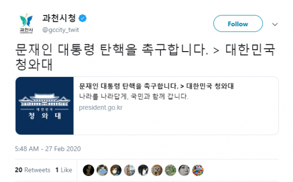 지난 27일 오후 10시 48분경 과천시는 트윗계정을 통해 '<문재인 대통령의 탄핵을 촉구합니다>대한민국 청와대'라는 트윗글을 올렸다. 아울러 국민청원에 올라온 대통령 탄핵청원을 링크해 내티즌들의 분노를 자아냈다.