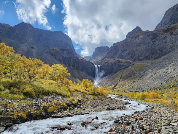 백두산 고원이 양쪽으로 갈라진 사이로 장백폭포에 흘러내린 물이 내를 이루고 있다. 하천을 사이에 두고 양쪽 산악지대 숲은 높은 지역에서 갈색과 노란색 단풍이 들었지만, 아래쪽에는 녹색 그대로였다. 9월 중순이지만 고산 지대에서 이미 단풍이 물들기 시작했다.